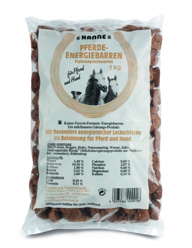 Ein gesundes Leckerli für Pferde und Hunde. Die Kanne Enzym-Ferment-Energiebarren werden nach alter Art im Bäckerofen gebacken. Das Qualitätsprodukt kann unbedenklich in jeder Menge gefüttert werden. Energiebarren eignen sich als hochwertiger Energielieferant und gleichzeitig als leckere Belohnung.