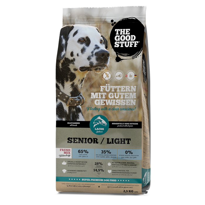 LACHS f?r ?ltere oder erwachsene Hunde mit geringer Aktivit?t ist ein getreidefreies Single Protein Trockenfutter in bew?hrter Super Premium-Qualit?t von THE GOODSTUFF. Lachs ist geschmacksintensiv und reich an wertvollen Vitaminen und N?hrstoffen. Unser Hunde-Trockenfutter wird schonend hergestellt, enth?lt frischen Lachs, Amaranth mit niedrigem glyk?mischen Index, regional verf?gbares Obst & Gem?se sowie ausgew?hlte Kr?uter. Dank Chondroitin und Glucosamin aus nat?rlichen Quellen (H?hnerknorpel, Krustentiere) sorgt diese spezielle Sorte von THE GOODSTUFF f?r eine optimale Unterst?tzung gesunder Gelenke. LACHS (Senior / Adult Light) ist ein Alleinfuttermittel f?r Hunde aller Rassen und Gr??en.