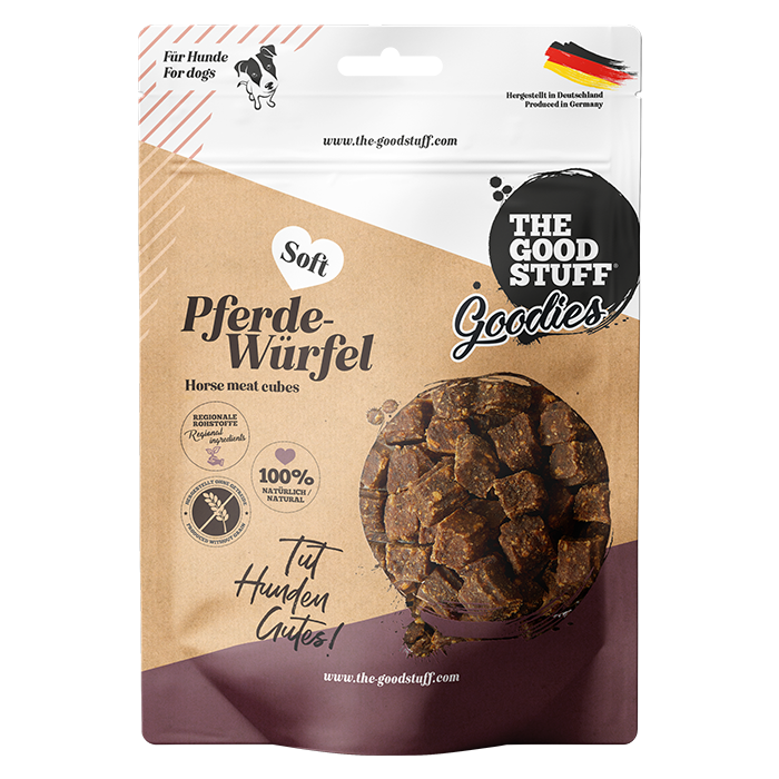 Ein Hundeleckerli der besonderen Art! Bestes Pferdefleisch – schonend und natürlich getrocknet. Dieser softe Hundesnack ist ideal in hundgerechte, feine Stückchen geformt und dadurch besonders angenehm zu kauen. Praktisch fürs Training oder für unterwegs – Dank wiederverschließbarem Beutel. Natürlich Single Protein, getreidefrei, ohne zugesetzten Zucker und ohne künstliche Aromen, Farb- oder Konservierungsstoffe!