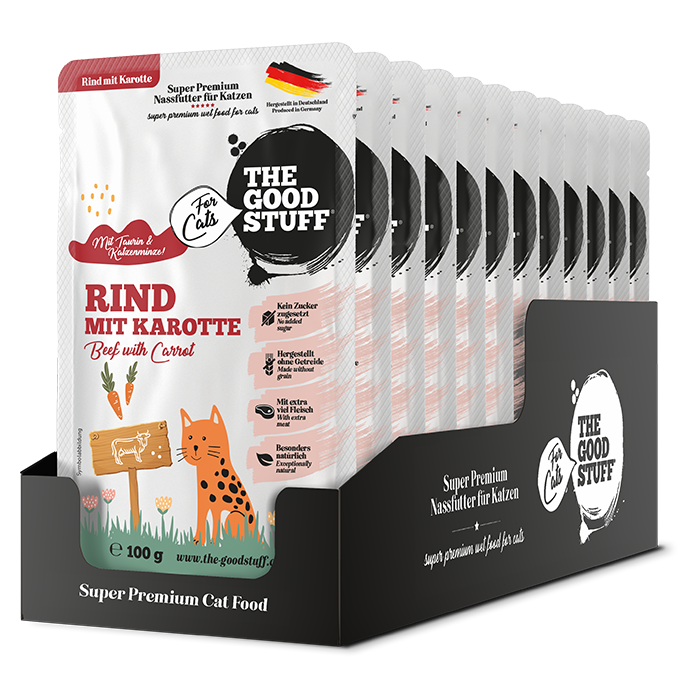 RIND mit KAROTTE ist ein getreidefreies Single Protein Nassfutter in bewährter Super Premium-Qualität von THE GOODSTUFF For Cats. Die besonders hohe Akzeptanz von THE GOODSTUFF For Cats ist das Ergebnis bester Rohstoffe: Rindfleisch ist besonders geschmacksintensiv, fettarm und reich an wertvollen Vitaminen und Nährstoffen. Unser Katzen-Nassfutter wird schonend gegart, enthält 70% frisches Rinder-Muskelfleisch und hochwertige Innereien von regionalen Lieferanten in bester Qualität, verfeinert mit regional verfügbarem Gemüse sowie Taurin und Katzenminze. RIND mit KAROTTE ist ein Alleinfuttermittel für Katzen aller Rassen und Größen.