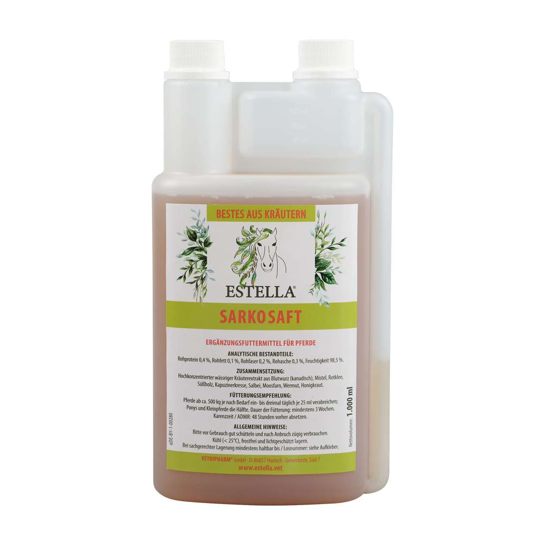 ESTELLA Sarkosaft – Natürlicher Kräuterauszug für Pferde mit sensibler Haut Sarkosaft von ESTELLA unterstützt den ganzheitlichen Ansatz einer Vitalstoffversorgung von Pferden mit sensibler Haut. Besonderes Augenmerk wird hier auf die phytotherapeutischen Eigenschaften der wirkungsvollen Pflanzenstoffe aus der kanadischen Blutwurz (die übrigens auch als Salbe – äußerlich angewendet – gute Ergebnisse erzielt) und der Mistel gelegt. ESTELLA Kräutersäfte werden unter besonders schonenden und Wirkstoffe erhaltenden Bedingungen hergestellt. Unter strenger Aufsicht und in enger Zusammenarbeit mit einem Fachtierarzt für Pferde und einem auf Tiere spezialisierten Phytotherapeuten wurden hocheffiziente Mischungen entwickelt. Nach intensiven Testphasen und genauen Analysen wurde hierfür ein besonders schonendes Herstellungsverfahren erstellt. Die konzentrieren wässrigen Kräuterlösungen sind frei von zugesetztem Zucker, Alkohol oder chemischen Mitteln. Hohe pflanzliche Wirkstoffextrakte ermöglichen niedrige Dosiermengen.