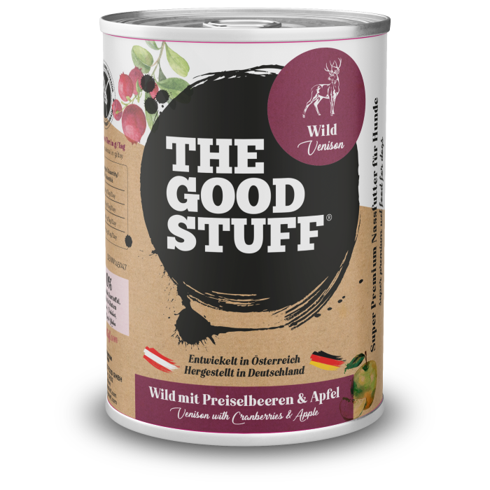 WILD mit PREISELBEEREN & APFEL ist ein getreidefreies Nassfutter in bew?hrter Super Premium-Qualit?t von THE GOODSTUFF. Wildfleisch ist besonders geschmacksintensiv, fettarm, reich an wertvollen Vitaminen und N?hrstoffen und auch f?r ern?hrungssensible Hunde geeignet. Unser Hunde-Nassfutter wird schonend gegart, enth?lt 70% frisches Wild-Muskelfleisch und hochwertige Innereien von regionalen Lieferanten in bester Qualit?t, verfeinert mit regional verf?gbarem Obst & Gem?se sowie ausgew?hlten Kr?utern und Lein?l. WILD mit PREISELBEEREN & APFEL ist ein Alleinfuttermittel f?r Hunde aller Rassen und Gr??en.